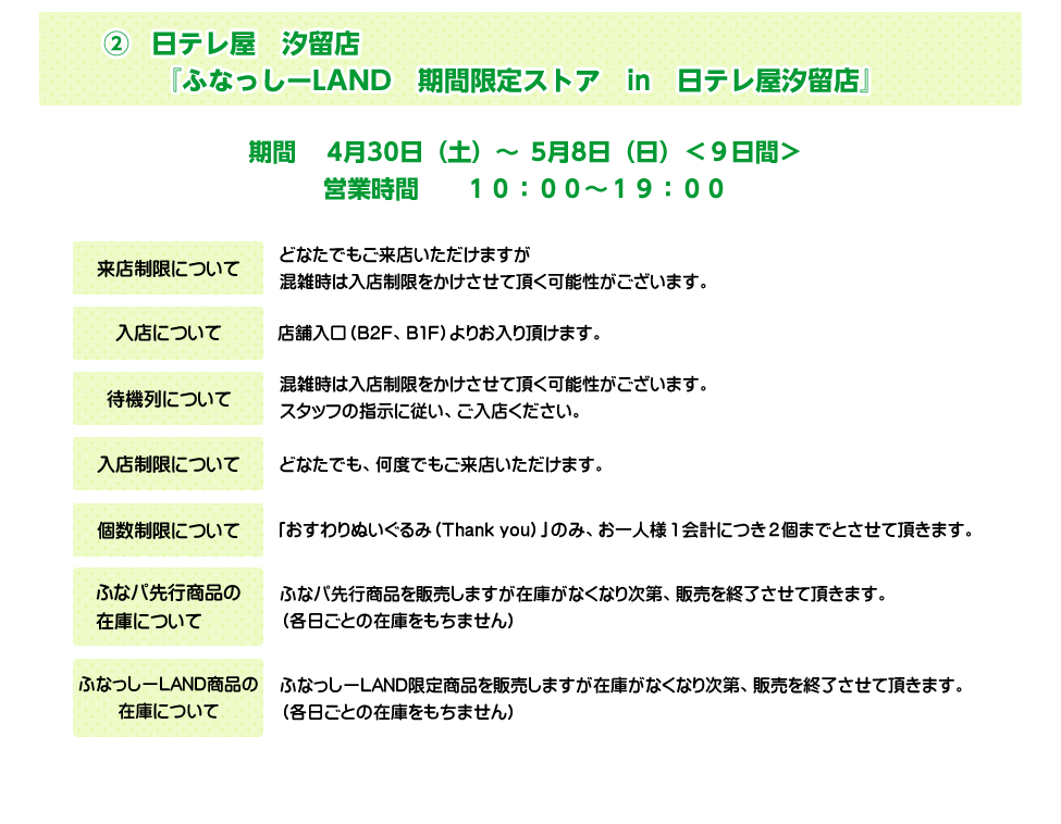 4月30日、5月1日に開催される「Meet ふなっしー!梨汁Thanks Party」なんと、このイベントに合わせて2日間限定でふなっしーLANDが汐留に登場します!!イベント先行発売グッズや、ふなっしーLANDのオリジナル新商品も発売予定。